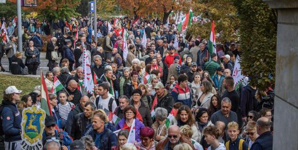 Rendant hommage aux « héros de 1956 », il a appelé à un changement de régime pacifique. « Le destin du peuple hongrois ne peut être décidé à Bruxelles, ni à Washington ou à Moscou », a-t-il déclaré, s’appropriant un discours traditionnellement porté par le Fidesz. « L’histoire est écrite par le peuple hongrois […] lorsqu’il choisit l’espoir plutôt que la peur. »