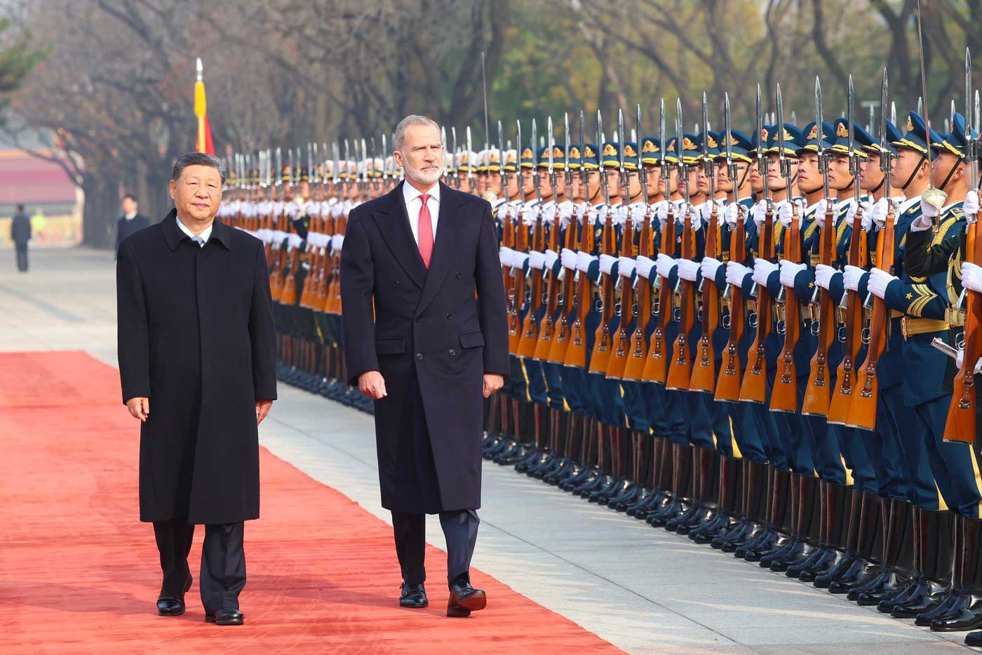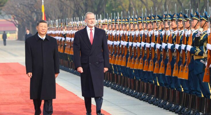 Après avoir passé en revue la garde d’honneur aux côtés de Xi Jinping, Felipe VI s’est entretenu avec le président chinois, accompagné notamment du ministre des Affaires étrangères, Wang Yi, et du ministre du Commerce, Wang Wentao. Les discussions ont porté sur le renforcement du dialogue bilatéral, le commerce et les échanges culturels.